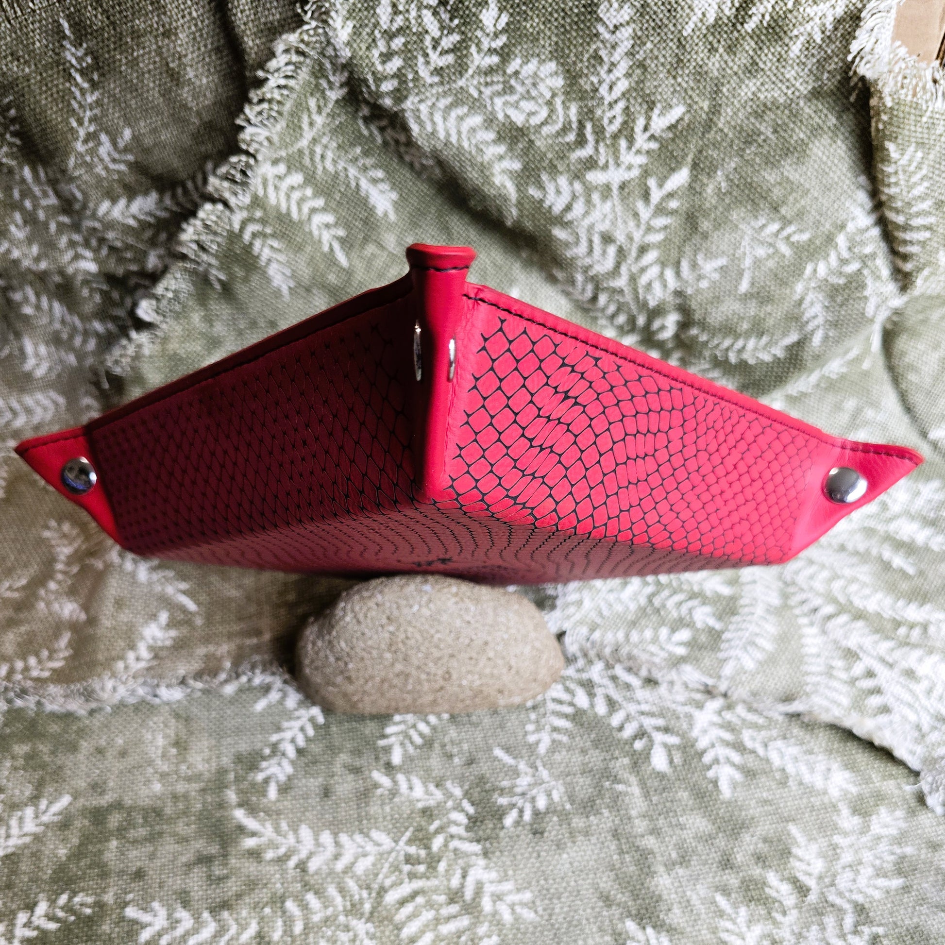 This versatile tray features an intricately detailed dragon engraving in bold black against vibrant red leatherette, complete with dragon scales that add texture and depth to the design. Perfect for tabletop gaming enthusiasts, jewelry lovers, or anyone who appreciates functional fantasy art.