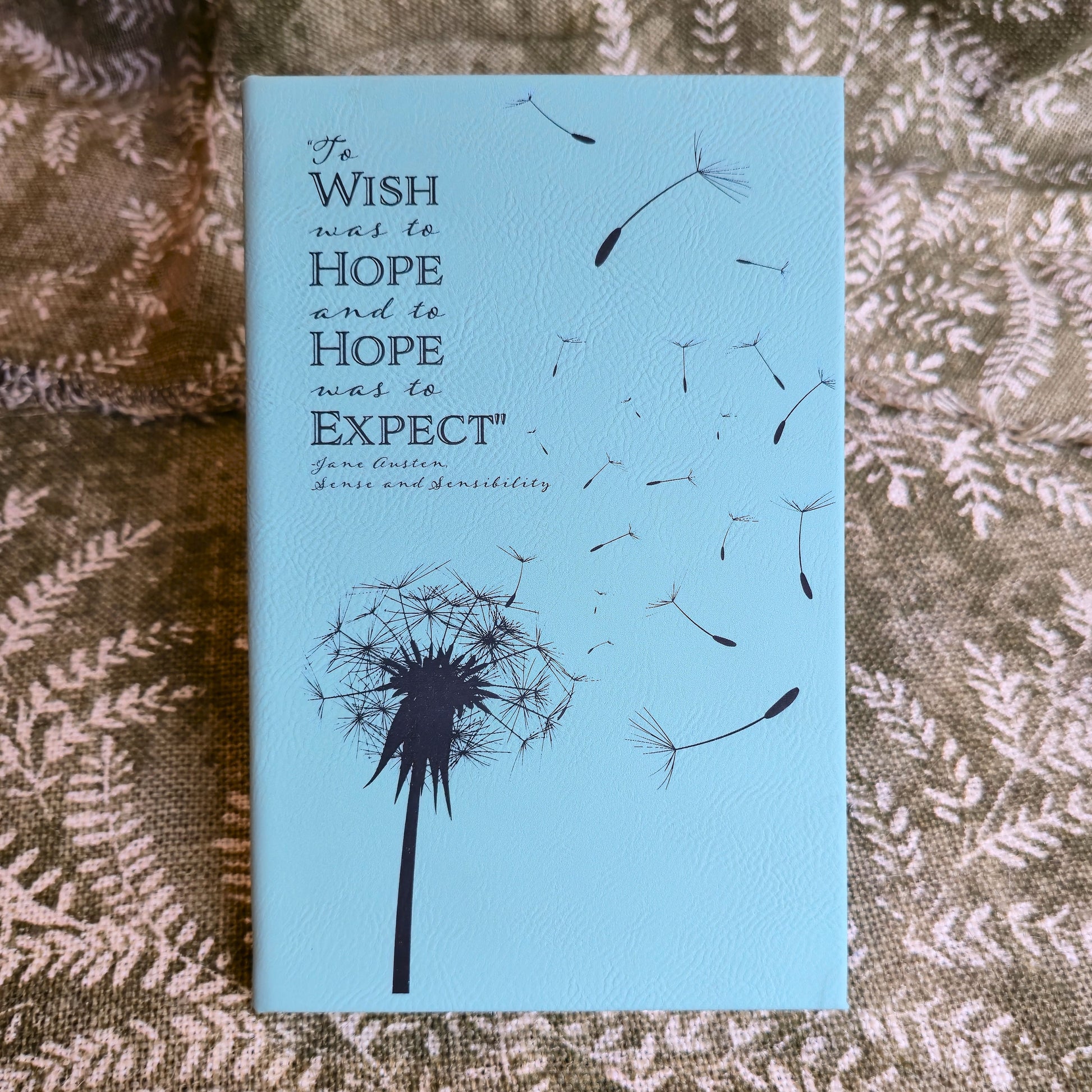Capture your thoughts and dreams in this beautifully engraved light blue leatherette journal featuring an inspiring Jane Austen quote: "To wish was to hope, and to hope was to expect."