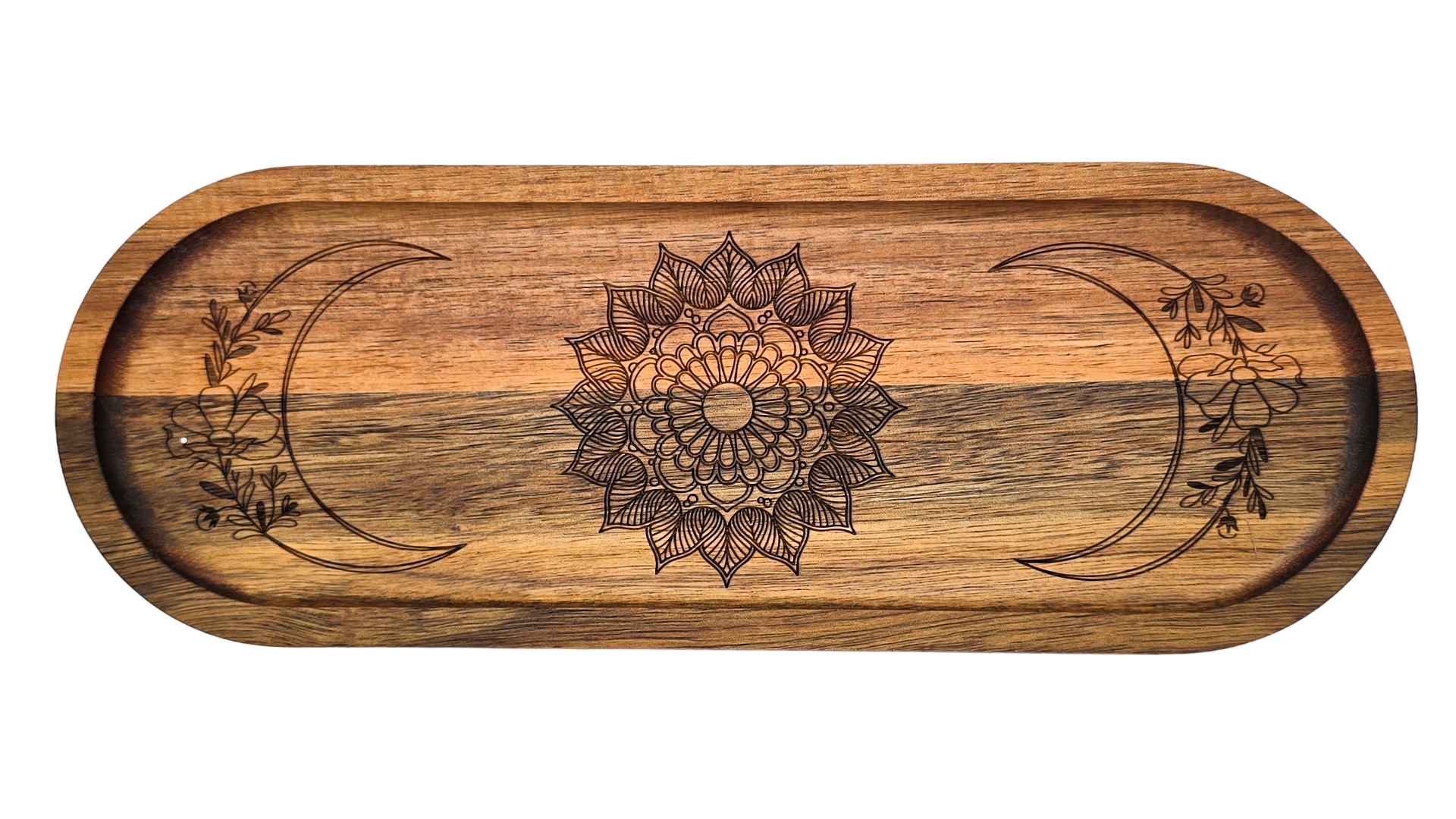 Each Mandala Moon Phase Acacia Tray is carefully laser-engraved with an intricate mandala and moon phase design, then hand-finished with food-grade tung oil for a beautiful, durable surface. The natural grain of the acacia wood makes every piece unique.